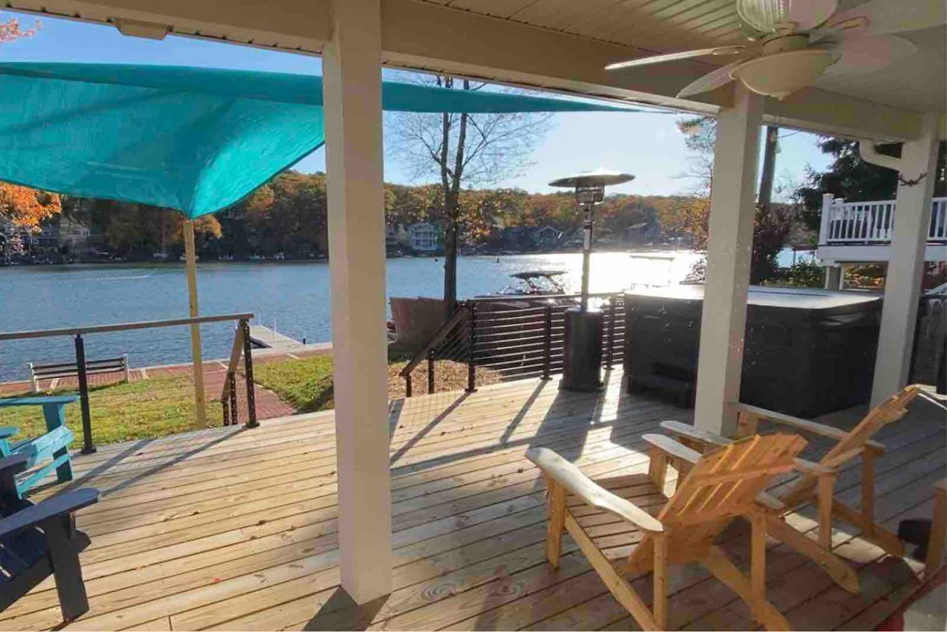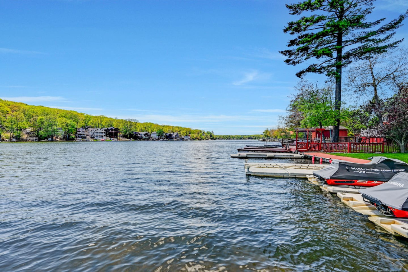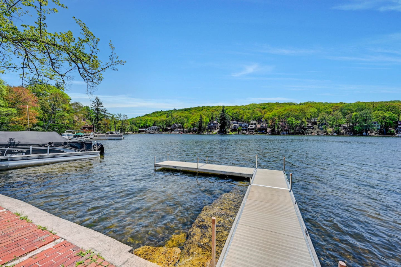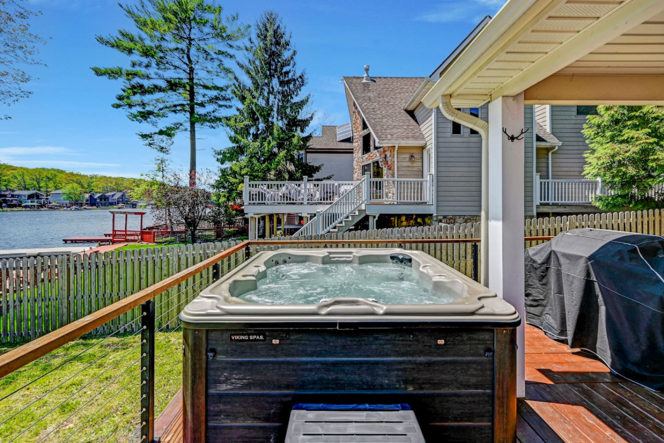 / nightWelcome to our charming LAKEFRONT getaway situated in a prime location on Lake Harmony. Our NEWLY BUILT home is located on a sunny level lot just feet from the waters edge. Enjoy unobstructed water views from the spacious deck in the brand New VIKING HOT TUB, or around a fire from our SOLO STOVE FIRE PIT. Take your pick of where to enjoy a meal from the numerous restaurants within walking distance. We are a few mins from skiing, hiking, golf, Pocono Raceway, waterpark and much more. Our 4 Season vacation home located 90 miles from NYC and Philadelphia offers everything you need to get away for some R & R. Large newly paved driveway offers ample parking for all guests. Enjoy beautiful lake views from the spacious deck in the brand new Viking Hot Tub, watch the sunset or star gaze around the fire Pit. Enjoy a game of Bocce Ball right by the water's edge. Guests are also able to fish off the dock in summer months in the lake which is stocked with bass. Also during the Summer season, enjoy the water on a kayak or SUP provided for guests. A gas grill is also available to prepare meals. Want to eat out? Many restaurants (Nick's Lake House, Shenanigan's, Louie's Prime Steak House, Terra Cottage, Piggy's, Hog Heaven Ice Cream) are just around the corner, a short walk away. If you're looking for memory-making experiences, there are plenty of activities to choose from, no matter the season. For anyone that loves to ski or snowboard, Jack Frost and Big Boulder are minutes away. You can also try hiking at the many trails that are close by at Hickory Run State Park or golfing at Split Rock Resort. Those who love to fish will appreciate access to the many close by trout streams that this area has to offer. If you're a big thrill-seeker, enjoy the day riding ATVs or simply treat yourself to spa day. Parents of little ones, we've got your family covered too! Your kids will love a visit to the alpacas at the Pohopoco Alpaca Farm or the animals at Claws n' Paws. Kalahari Indoor/Outdoor Waterpark is also a short drive away for kids that want to enjoy a little swim all year long. Enjoy evenings playing games by the indoor fireplace. A 55" Roku Smart TV is also available to stream your favorite shows or movies with access to an Amazon Firestick. Kitchen is equipped with K-Cup coffee maker, toaster oven, dishwasher, microwave and other bare essentials. Fresh linens and towels are also provided for guests. Two queens and a full over full bunk bed in the 3 bedrooms provide a comfortable place to rest for the night. (Shampoo and body soap not provided) Guests have access to entire house except the owners closets (locked closets in Master Bath and Hallway next to laundry), and garage without owners permission. There are security cameras by the garage, front yard, and the rear of the property. Pontoon boat is NOT for guest use. We pride ourselves on being available and responsive! Please reach out with any questions or concerns. We want to provide you with a 5 star experience. Lakefront property on Lake Harmony. Walking distance to many restaurants serving breakfast, lunch, and dinner. Big Boulder and Jack Frost ski resorts are minutes away.