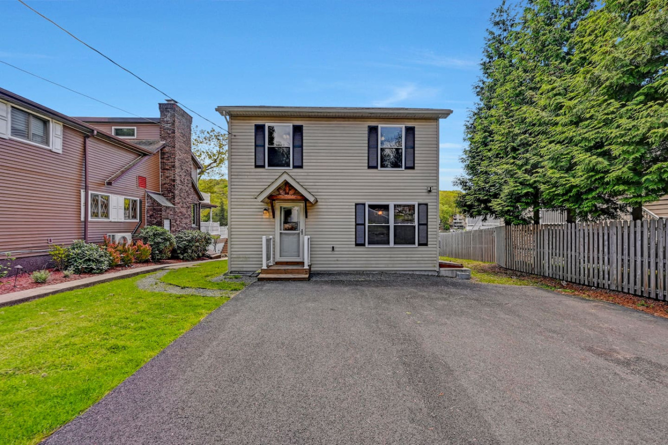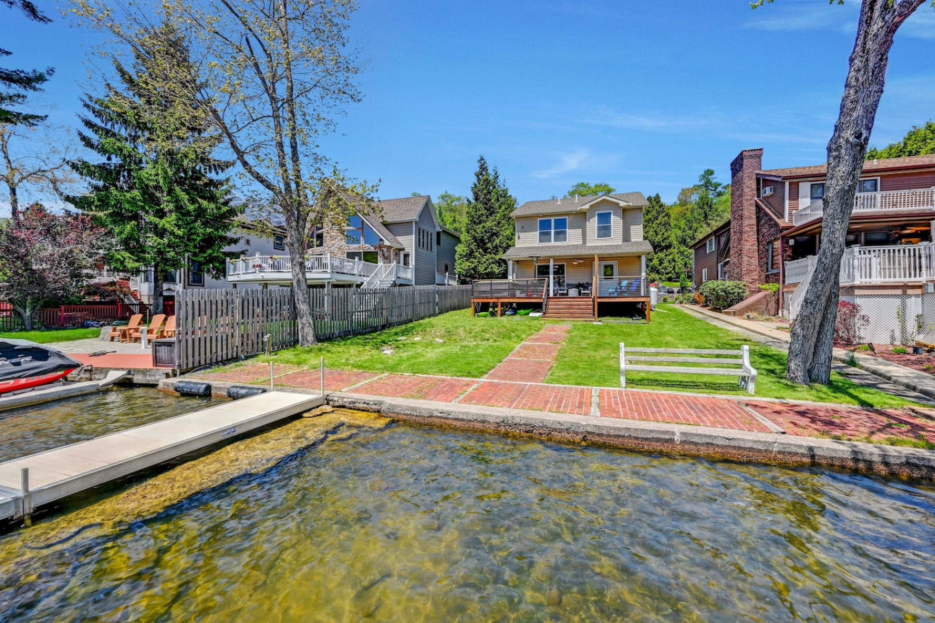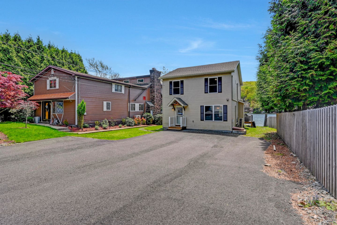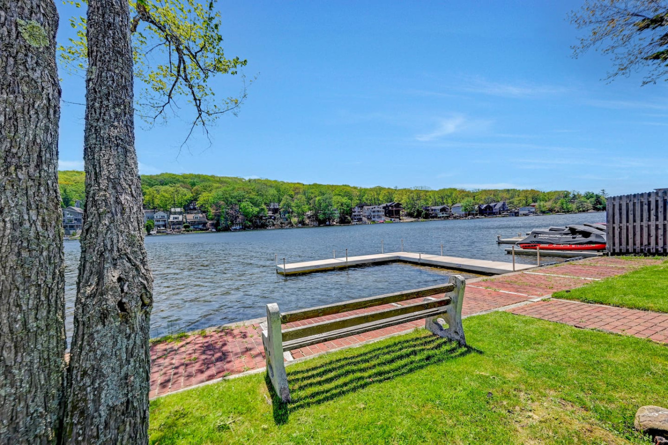 / nightWelcome to our charming LAKEFRONT getaway situated in a prime location on Lake Harmony. Our NEWLY BUILT home is located on a sunny level lot just feet from the waters edge. Enjoy unobstructed water views from the spacious deck in the brand New VIKING HOT TUB, or around a fire from our SOLO STOVE FIRE PIT. Take your pick of where to enjoy a meal from the numerous restaurants within walking distance. We are a few mins from skiing, hiking, golf, Pocono Raceway, waterpark and much more. Our 4 Season vacation home located 90 miles from NYC and Philadelphia offers everything you need to get away for some R & R. Large newly paved driveway offers ample parking for all guests. Enjoy beautiful lake views from the spacious deck in the brand new Viking Hot Tub, watch the sunset or star gaze around the fire Pit. Enjoy a game of Bocce Ball right by the water's edge. Guests are also able to fish off the dock in summer months in the lake which is stocked with bass. Also during the Summer season, enjoy the water on a kayak or SUP provided for guests. A gas grill is also available to prepare meals. Want to eat out? Many restaurants (Nick's Lake House, Shenanigan's, Louie's Prime Steak House, Terra Cottage, Piggy's, Hog Heaven Ice Cream) are just around the corner, a short walk away. If you're looking for memory-making experiences, there are plenty of activities to choose from, no matter the season. For anyone that loves to ski or snowboard, Jack Frost and Big Boulder are minutes away. You can also try hiking at the many trails that are close by at Hickory Run State Park or golfing at Split Rock Resort. Those who love to fish will appreciate access to the many close by trout streams that this area has to offer. If you're a big thrill-seeker, enjoy the day riding ATVs or simply treat yourself to spa day. Parents of little ones, we've got your family covered too! Your kids will love a visit to the alpacas at the Pohopoco Alpaca Farm or the animals at Claws n' Paws. Kalahari Indoor/Outdoor Waterpark is also a short drive away for kids that want to enjoy a little swim all year long. Enjoy evenings playing games by the indoor fireplace. A 55" Roku Smart TV is also available to stream your favorite shows or movies with access to an Amazon Firestick. Kitchen is equipped with K-Cup coffee maker, toaster oven, dishwasher, microwave and other bare essentials. Fresh linens and towels are also provided for guests. Two queens and a full over full bunk bed in the 3 bedrooms provide a comfortable place to rest for the night. (Shampoo and body soap not provided) Guests have access to entire house except the owners closets (locked closets in Master Bath and Hallway next to laundry), and garage without owners permission. There are security cameras by the garage, front yard, and the rear of the property. Pontoon boat is NOT for guest use. We pride ourselves on being available and responsive! Please reach out with any questions or concerns. We want to provide you with a 5 star experience. Lakefront property on Lake Harmony. Walking distance to many restaurants serving breakfast, lunch, and dinner. Big Boulder and Jack Frost ski resorts are minutes away.