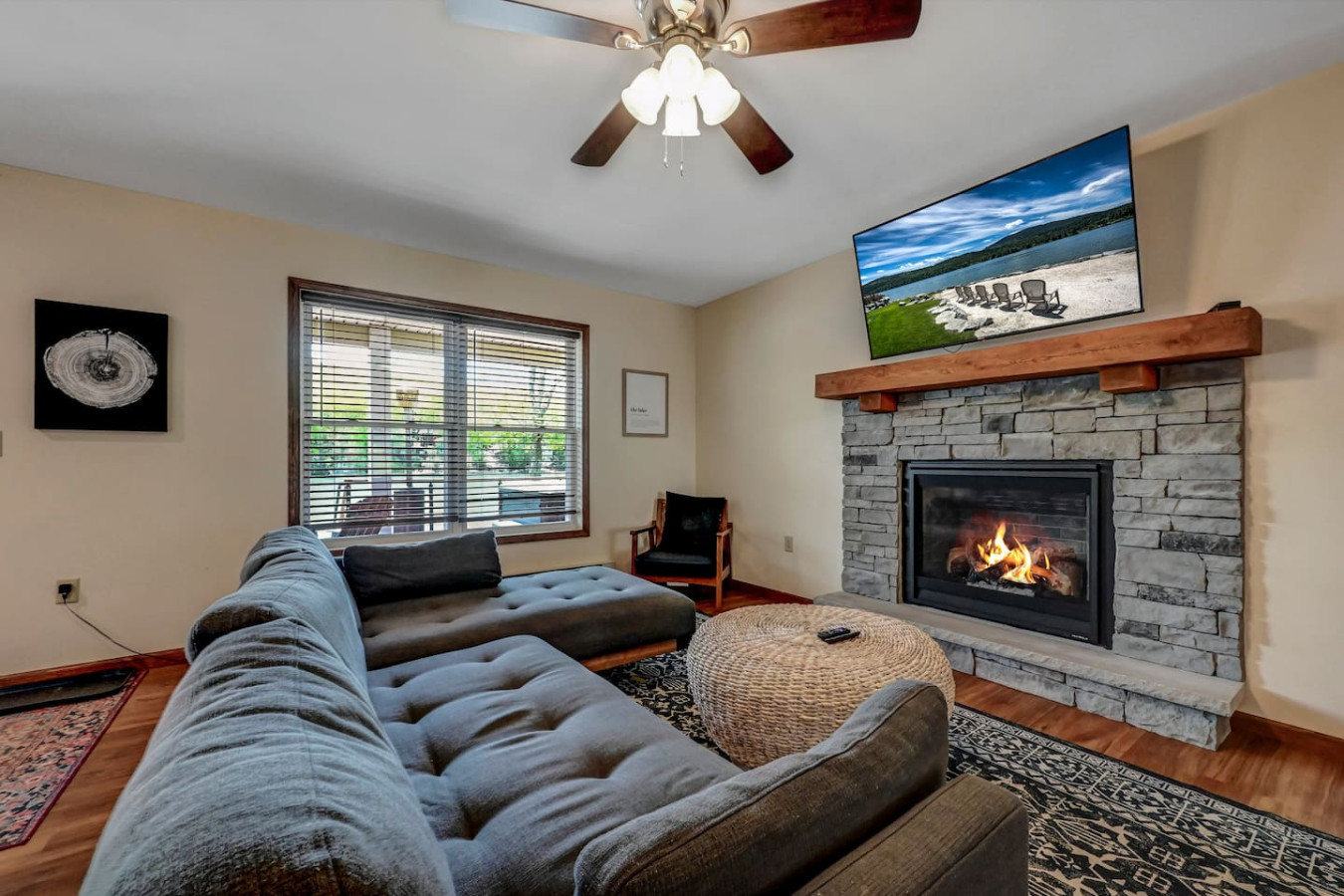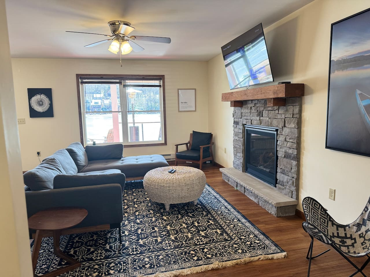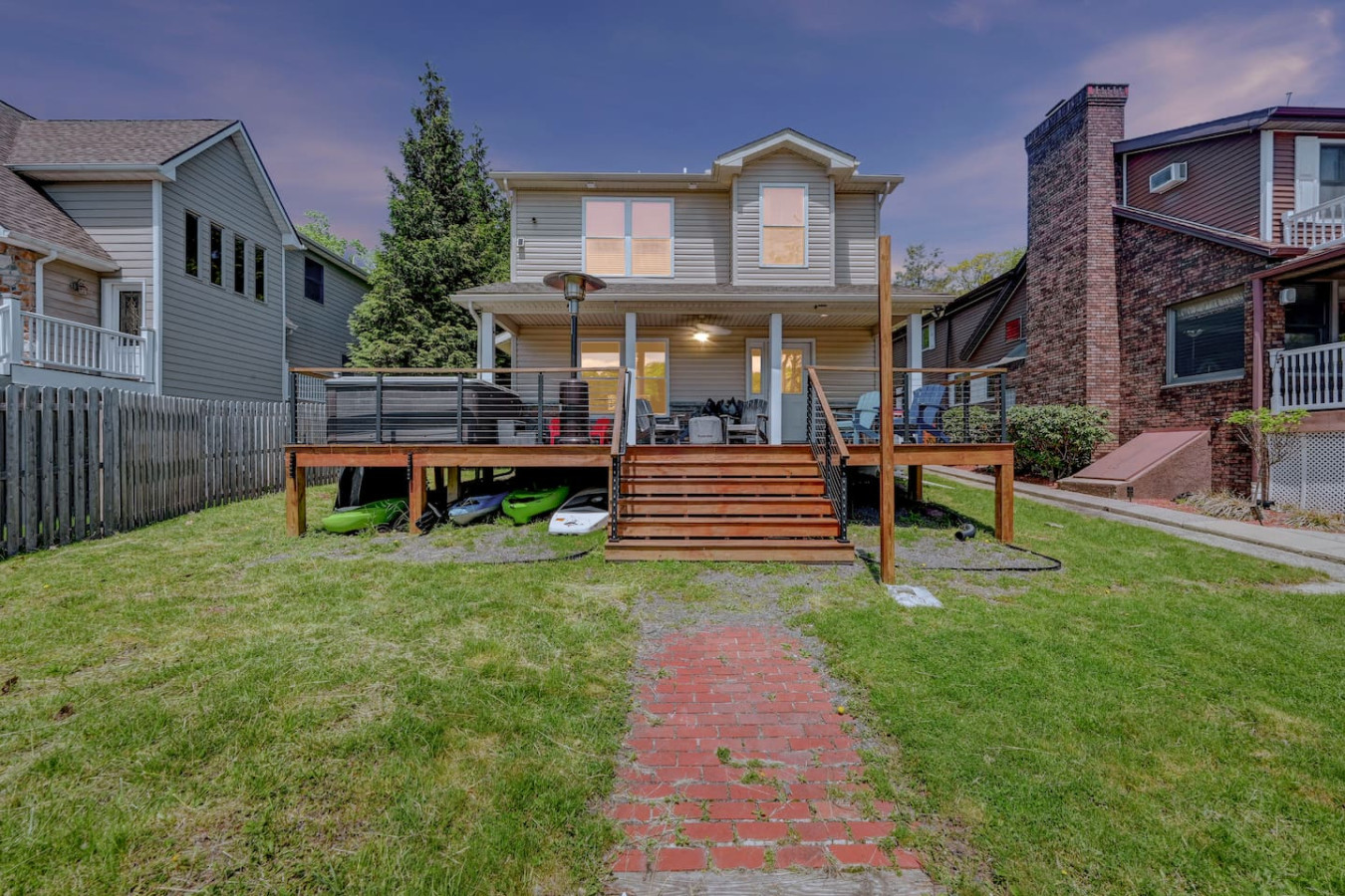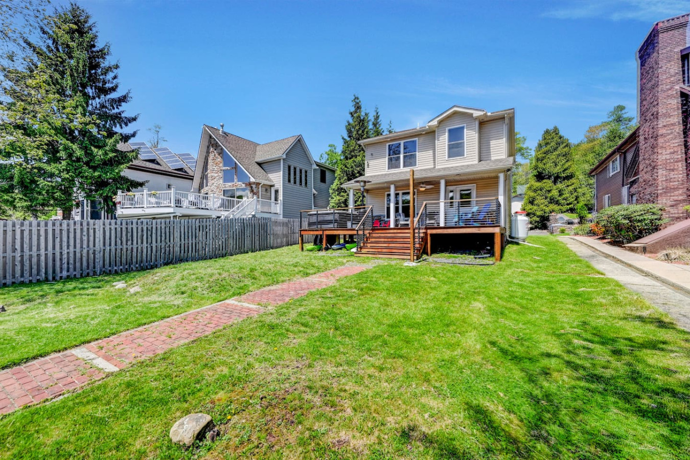 / nightWelcome to our charming LAKEFRONT getaway situated in a prime location on Lake Harmony. Our NEWLY BUILT home is located on a sunny level lot just feet from the waters edge. Enjoy unobstructed water views from the spacious deck in the brand New VIKING HOT TUB, or around a fire from our SOLO STOVE FIRE PIT. Take your pick of where to enjoy a meal from the numerous restaurants within walking distance. We are a few mins from skiing, hiking, golf, Pocono Raceway, waterpark and much more. Our 4 Season vacation home located 90 miles from NYC and Philadelphia offers everything you need to get away for some R & R. Large newly paved driveway offers ample parking for all guests. Enjoy beautiful lake views from the spacious deck in the brand new Viking Hot Tub, watch the sunset or star gaze around the fire Pit. Enjoy a game of Bocce Ball right by the water's edge. Guests are also able to fish off the dock in summer months in the lake which is stocked with bass. Also during the Summer season, enjoy the water on a kayak or SUP provided for guests. A gas grill is also available to prepare meals. Want to eat out? Many restaurants (Nick's Lake House, Shenanigan's, Louie's Prime Steak House, Terra Cottage, Piggy's, Hog Heaven Ice Cream) are just around the corner, a short walk away. If you're looking for memory-making experiences, there are plenty of activities to choose from, no matter the season. For anyone that loves to ski or snowboard, Jack Frost and Big Boulder are minutes away. You can also try hiking at the many trails that are close by at Hickory Run State Park or golfing at Split Rock Resort. Those who love to fish will appreciate access to the many close by trout streams that this area has to offer. If you're a big thrill-seeker, enjoy the day riding ATVs or simply treat yourself to spa day. Parents of little ones, we've got your family covered too! Your kids will love a visit to the alpacas at the Pohopoco Alpaca Farm or the animals at Claws n' Paws. Kalahari Indoor/Outdoor Waterpark is also a short drive away for kids that want to enjoy a little swim all year long. Enjoy evenings playing games by the indoor fireplace. A 55" Roku Smart TV is also available to stream your favorite shows or movies with access to an Amazon Firestick. Kitchen is equipped with K-Cup coffee maker, toaster oven, dishwasher, microwave and other bare essentials. Fresh linens and towels are also provided for guests. Two queens and a full over full bunk bed in the 3 bedrooms provide a comfortable place to rest for the night. (Shampoo and body soap not provided) Guests have access to entire house except the owners closets (locked closets in Master Bath and Hallway next to laundry), and garage without owners permission. There are security cameras by the garage, front yard, and the rear of the property. Pontoon boat is NOT for guest use. We pride ourselves on being available and responsive! Please reach out with any questions or concerns. We want to provide you with a 5 star experience. Lakefront property on Lake Harmony. Walking distance to many restaurants serving breakfast, lunch, and dinner. Big Boulder and Jack Frost ski resorts are minutes away.